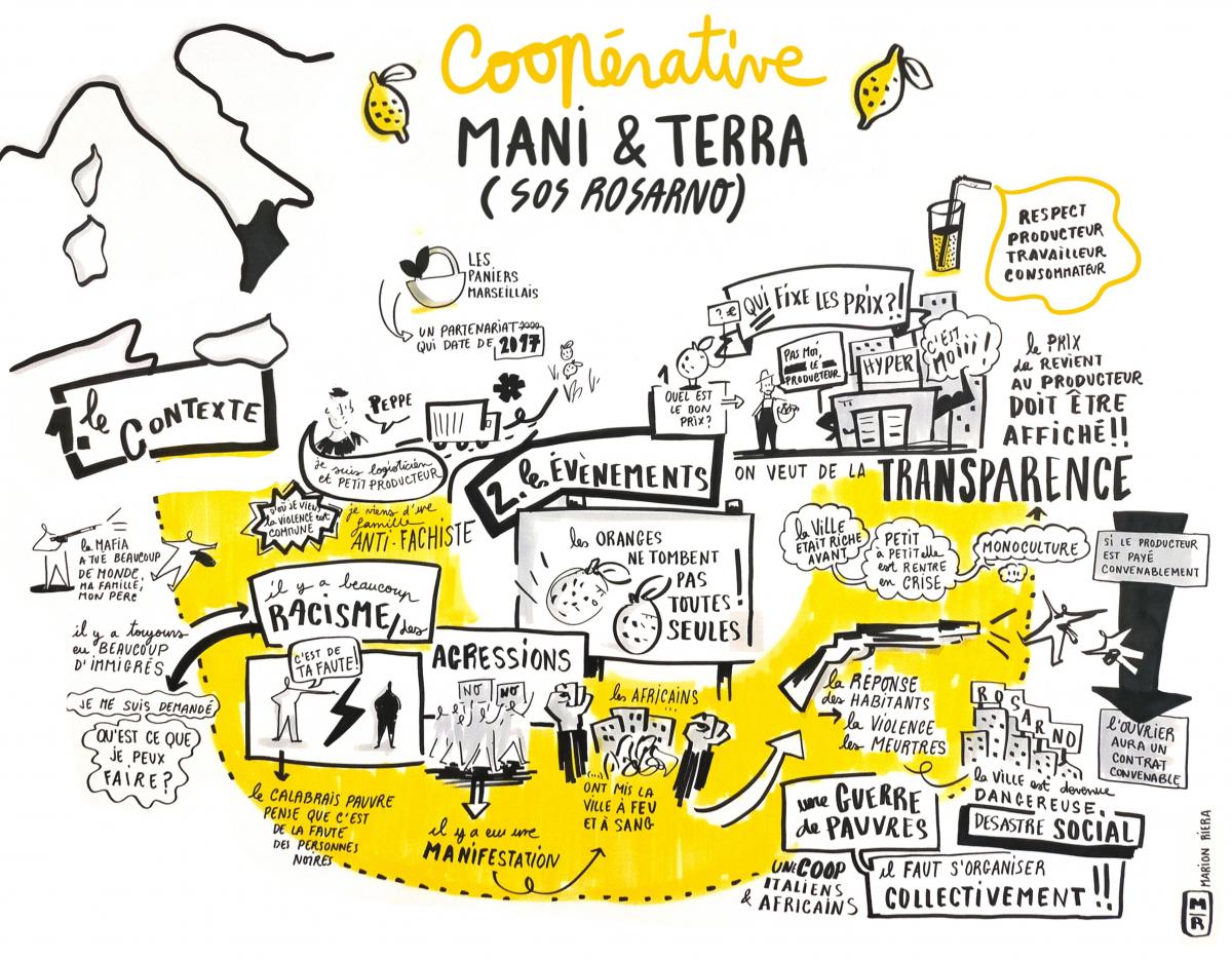 L'ENGAGEMENT DE LA COOPÉRATIVE SOCIALE MANI E TERRA, notre partenaire depuis 2017 : Suite aux « faits de Rosarno », des militants et des paysans de la Plaine de Goia Tauro choisissent de réagir. La coopérative Mani e Terra, qui réunit depuis quelques années une centaine de petits agriculteurs (et une cinquantaine d'employés) qui ont choisit un modèle agricole alternatif à la monoculture intensive et à la grande distribution, lance la campagne "SOS Rosarno". L’objectif : produire et vendre des agrumes biologiques produits dans le respect des contrats de travail, de la légalité et de la dignité de tous les travailleurs et travailleuses. Nino Quaranta, qui a désormais quitté la coopérative, e Peppe Pugliese sont à l’origine de l’initiative.