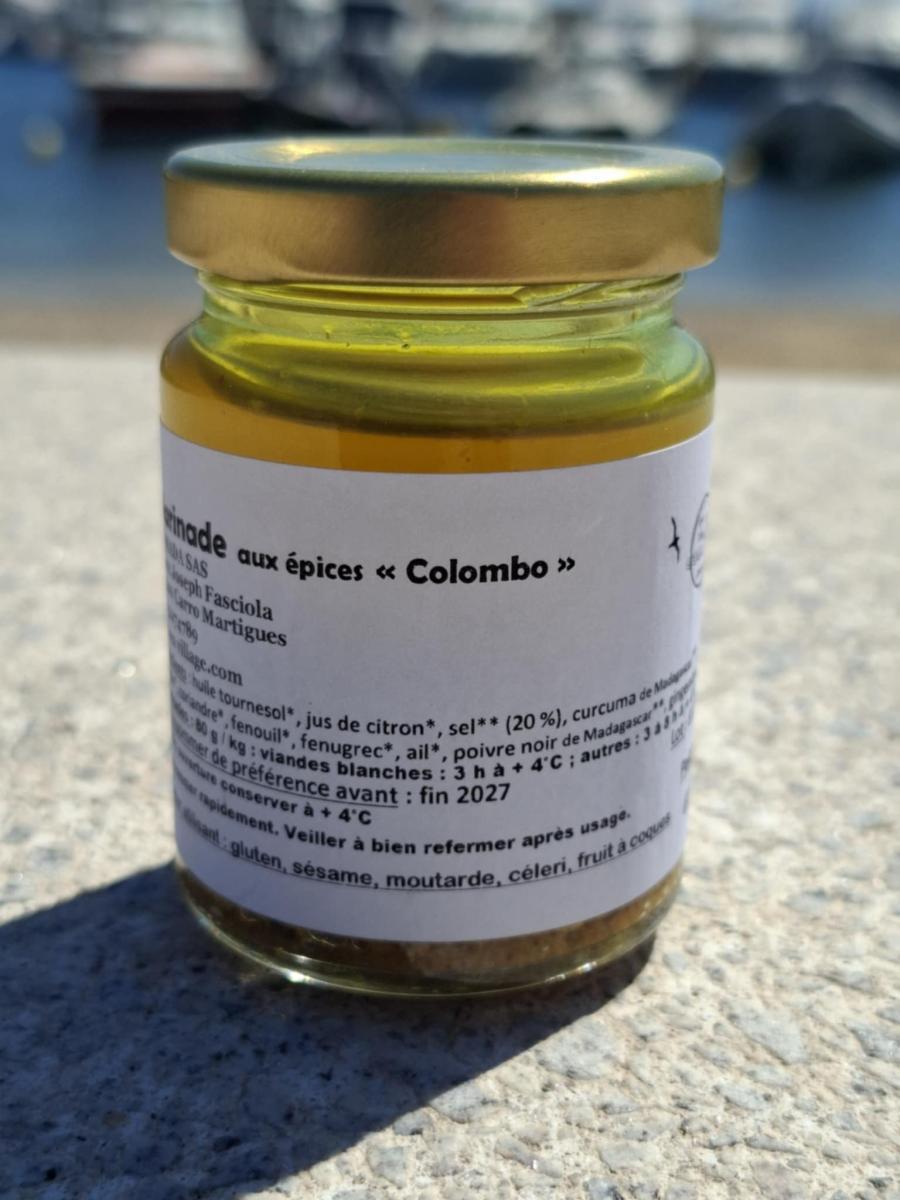 La marinade aux épices colombo contient : huile tournesol, jus de citron, sel, curcuma de Madagascar, cumin, coriandre, fenouil, fenugrec, ail, poivre noir de Madagascar, gingembre de Madagascar, oignon.