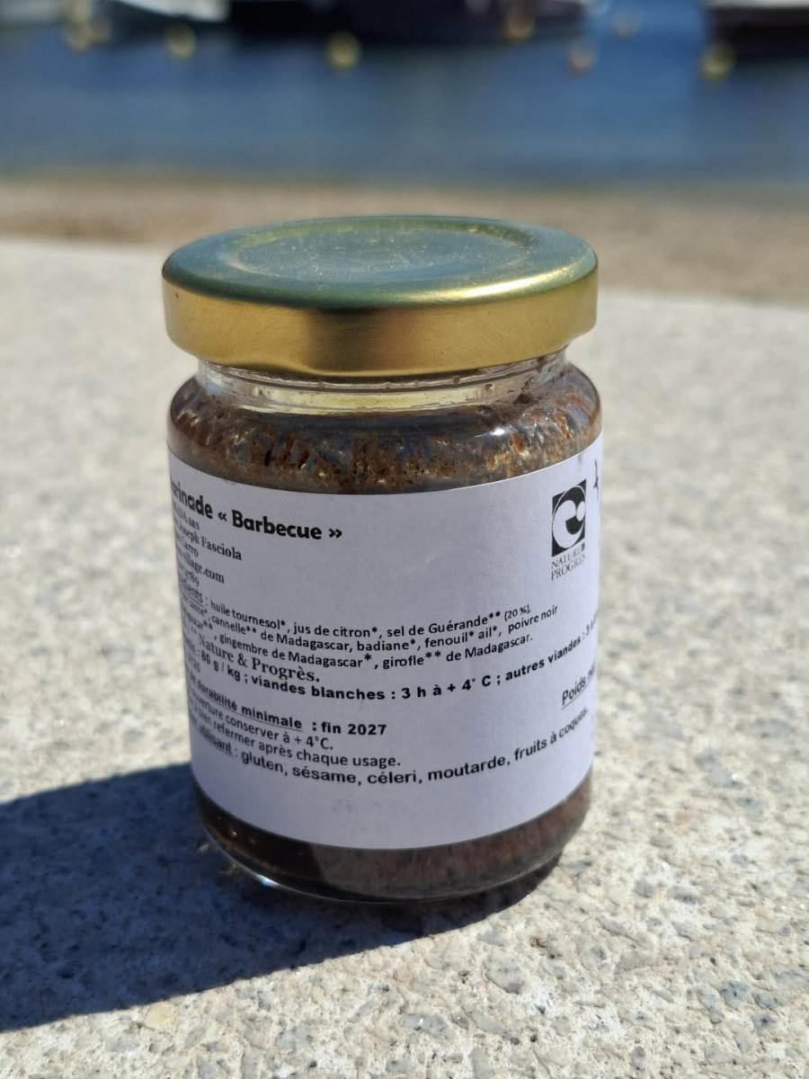 Ses ingrédients : huile tournesol, jus de citron, sel de Guérande (20 %), sucre pur canne, cannelle de Madagascar, badiane, fenouil, ail, poivre noir de Madagascar, gingembre de Madagascar, girofle de Madagascar.