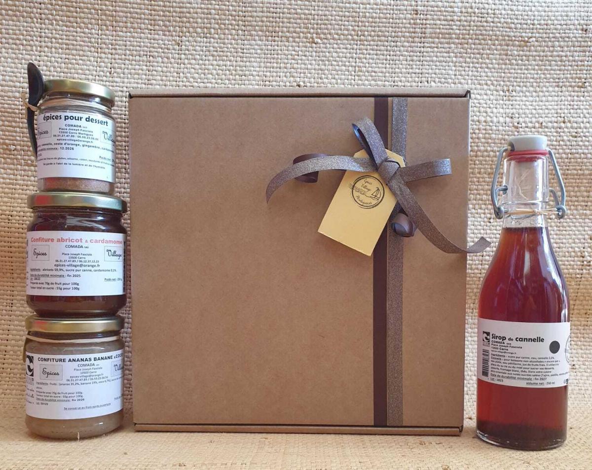 valise "douceurs des îles contient : 1 sirop d'épices au choix (cannelle, gingembre, curcuma, ou fleurs d'hibiscus) 250 ml + 2 pots de confitures exotiques au choix 230 g + 1 mélange d'épices à dessert 35 g