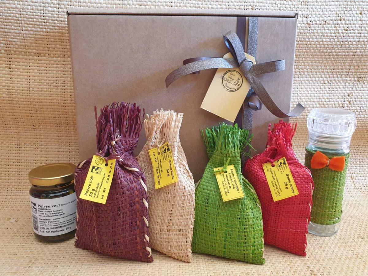 Cette valise marque l'essentiel de nos poivres, elle contient : 1 ballotin de poivre noir (50 g) + 1 ballotin de poivre blanc (50 g) + 1 ballotin de poivre sauvage ou poivre de Timut (20 g) + 1 ballotin de baies roses (25 g) + 1 pot de poivre vert frais s/s vinaigre (55 g) + 1 moulin corset raphia rechargeable et réglable pour 50 g de graines dures.